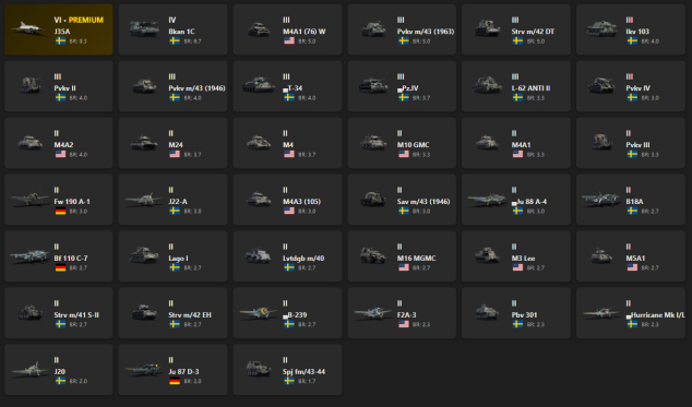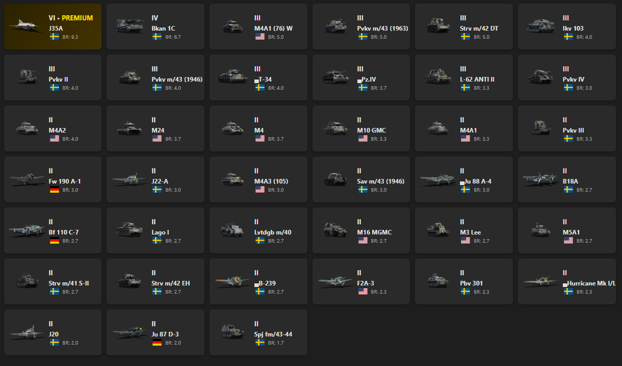 VI - 1 J35A, Bkan 1C, M4A1 (76) W, Pvkv m/43 (1963), Strv m/42 DT, Ikv 103, Pvkv II, Pvkv m/43 (1946), T-34, Pz.IV
