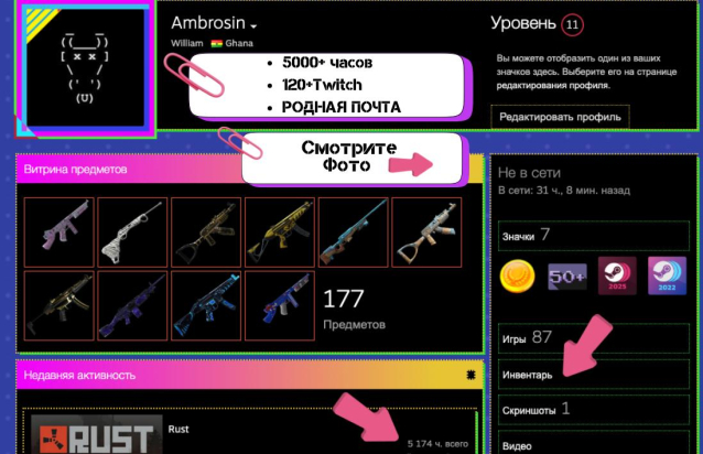⚡️ ПОЛНЫЙ ДОСТУП ⚡️ Rust ⚡️ 120+Skins ⚡️ 5000+ЧАСОВ ⚡️ АВТО ⚡️ Родная почта ⚡️ Steam ⚡️ Смена данных ⚡️ СМОТРИТЕ ОПИСАНИЕ ⚡️Платформа: Steam