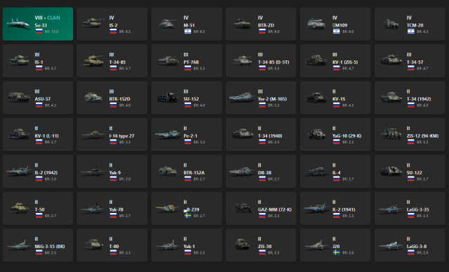 VIII - 1 Su-33, IS-2, M-51, BTR-ZD, M109, TCM-20, IS-1, T-34-85, PT-76B, T-34-85 (D-5T), KV-1 (ZiS-5), T-34-57