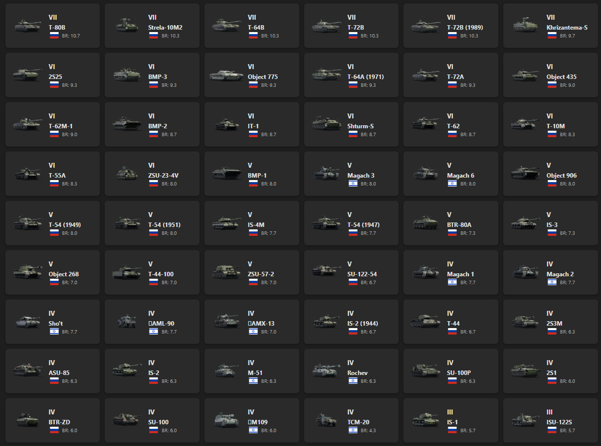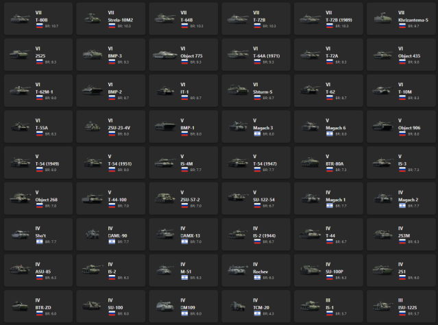 VII - 6, VI - 14 T-80B, Strela-10M2, T-64B, T-72B, T-72B (1989), Khrizantema-S, 2S25, BMP-3, Object 775, T-64A (1971), T-72A
