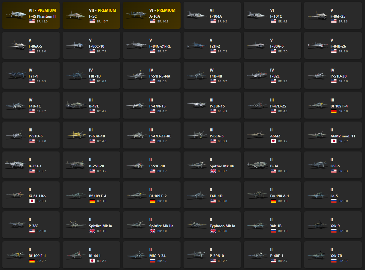 VII - 2, VI - 3, V - 7 F-4S Phantom II, F-5C, A-10A, F-104A, F-104C, F-86F-25, F-86A-5, F-80C-10, F-84G-21-RE, F2H-2