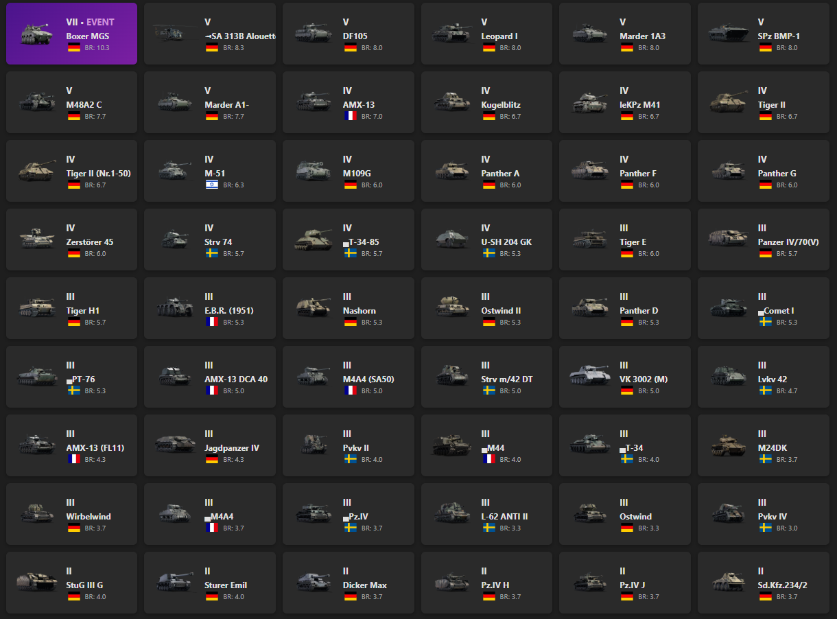 VII - 1, V - 7 Boxer MGS, SA 313B Alouette II, DF105, Leopard I, Marder 1A3, SPz BMP-1, M48A2 C, Marder A1-, AMX-13