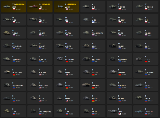 VII - 1, V - 2 2S38, I-29, DB-7, IS-3, T-44-100, IS-2 (1944), T-44, ASU-85, IS-2, M-51, SU-100P, IS-1, T-34-85, ISU-122