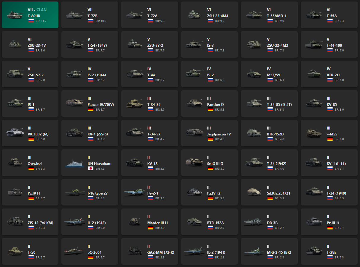 VII - 2, VI - 5, V - 6 T-80UK, T-72B, T-72A, ZSU-23-4M4, T-55AMD-1, T-55A, ZSU-23-4V, T-54 (1947), ZSU-37-2, IS-3, ZSU-23-4M2