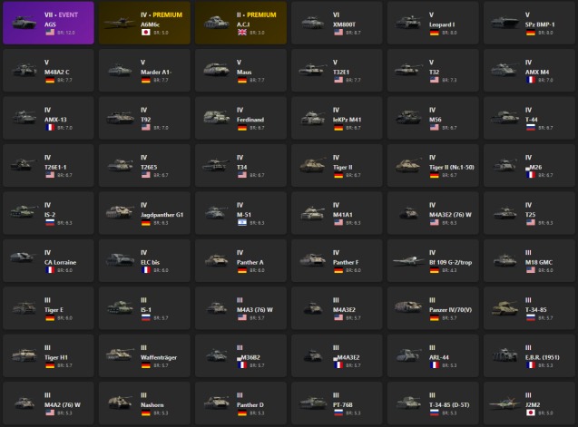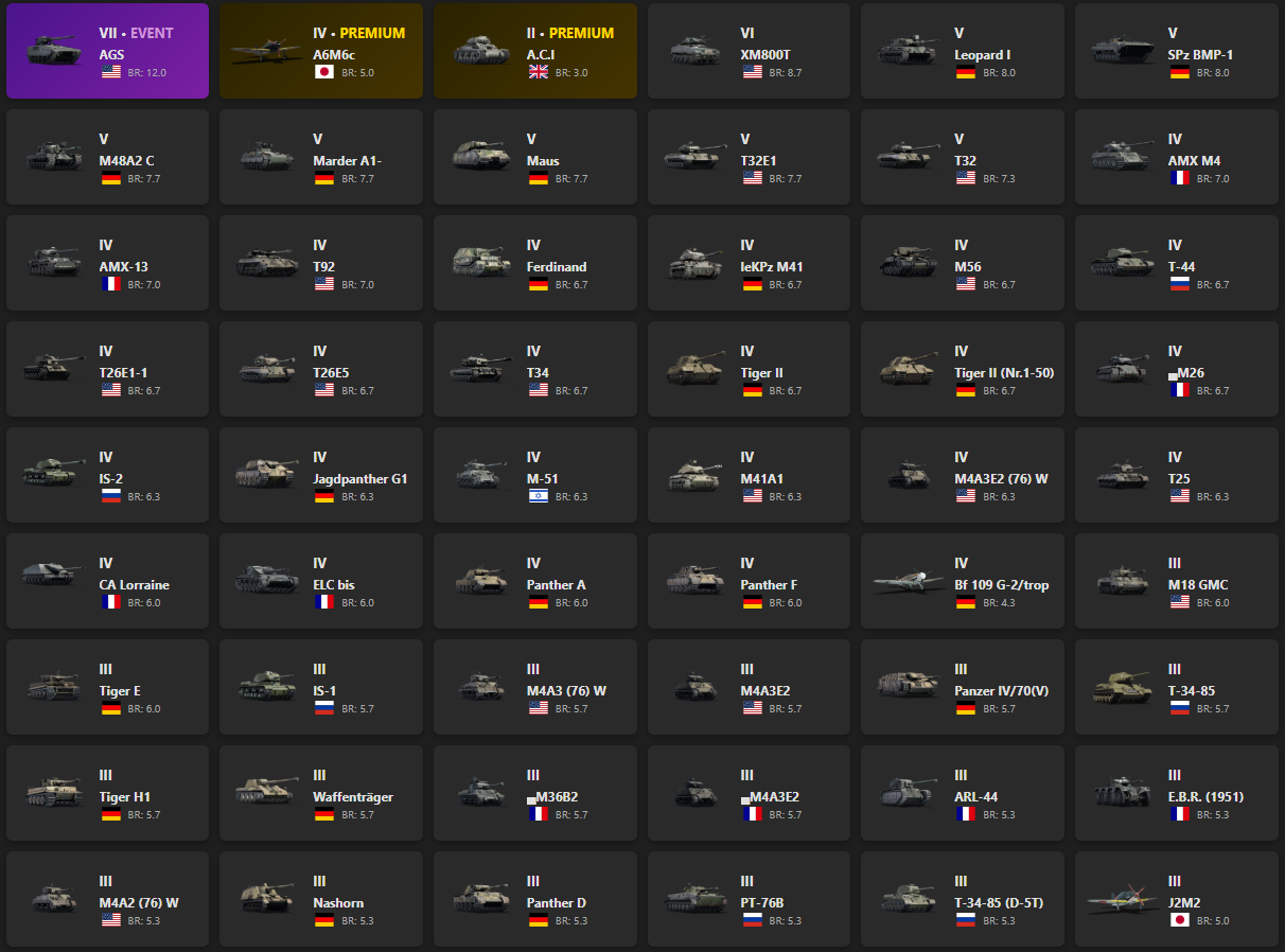 VII - 1, VI - 1, V - 7 AGS, A6M6c, A.C.I, XM800T, Leopard I, SPz BMP-1, M48A2 C, Marder A1-, Maus, T32E1, AMX M4