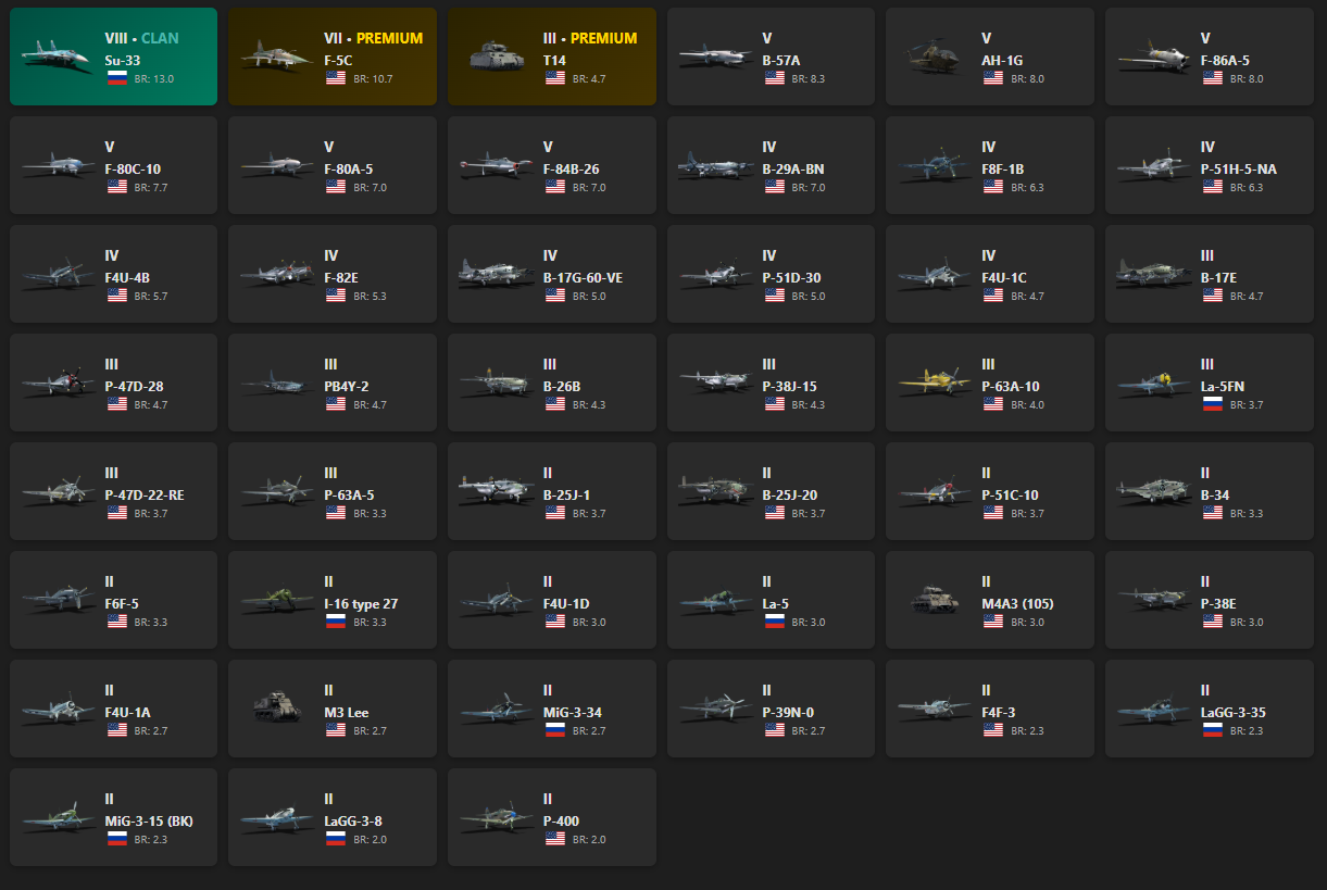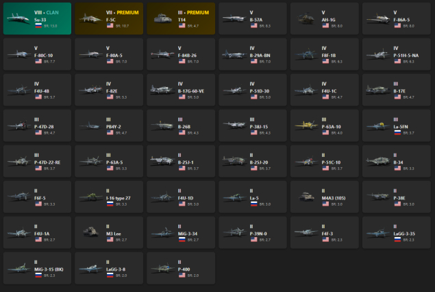 VIII - 1, VII - 1 Su-33, F-5C, T14, B-57A, AH-1G, F-86A-5, F-80C-10, F-80A-5, F-84B-26, B-29A-BN, F8F-1B, P-51H-5-NA
