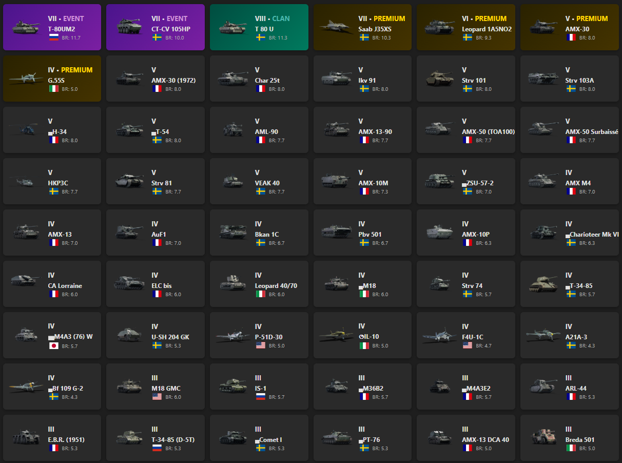 VIII - 1, VII - 3 T-80UM2, CT-CV 105HP, T 80 U, Saab J35XS, Leopard 1A5NO2, AMX-30, G.55S, AMX-30 (1972), Char 25t
