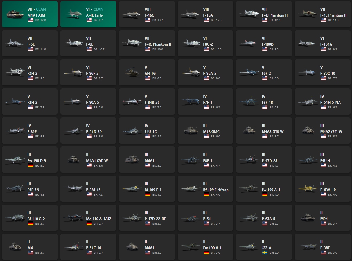 VIII - 2, VII - 6, VI - 6, V - 7 M1A1 AIM, A-4E Early, F-16C, F-16A, F-4J Phantom II, F-4E Phantom II, F-5E, F-8E, F-4C Phantom II