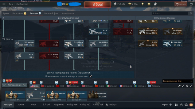 Франция Авиация: есть пакетный прем, 7 ранг Mirage F1C-200 и открыт 8 ранг, исследуется Mirage 4000, куплен Mirage 2000-5F .