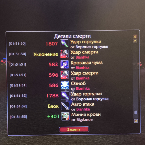 Подробное описание: Аддон «Детали смерти» где можно посмотреть какие уроны и хилы, от кого получили.