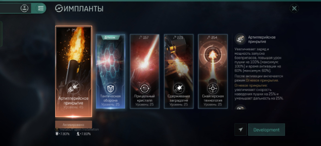 Имплант 45, есть банки для прокачки ещё одного импланта. Дуал Омеги на три года, можно не думать о ней.