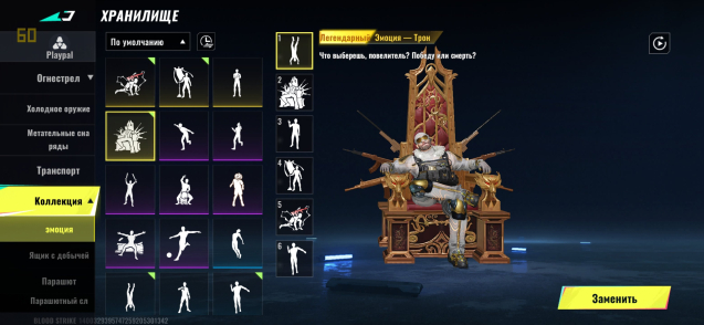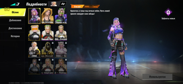 1 Бесподобный-М4А1(Lv3) 2 Бесподобный-AK 47 (lv3) 3 Бесподобный-AUG (lv6) Full! идеально если основное оружие 4 Бесподобный-Fal Lv2 + коллаб скин с атакой титанов 5 Бесподобный-EVO Scar (Lv2) 6 Бесподобный-MP5 (Lv3) 7 Бесподобный-Vector (Lv2) 8 Бесподобный-P90 (Lv2)9 Бесподобный-Узи(Lv2)10 Бесподобный-M700 (Lv2) + коллаб скин с актакой титанов11 Бесподобный-Kar98k (lv2)12 Бесподобный- Kag6 (Lv3) доступна анимация осмотра 14 БЕСПОДОБНЫЙ Galil Noxadra 13 Ультра MCX (Lv2) Через 40 дней будет доступен еще один ультра скин Хання14 Ультра URB (Lv2)15 Ультра INP9 (Lv2)16 Ультра Origin12 17 Ультра Глок Lv5 FullОстальные либо легендарки либо обычки с редкими 4 ультра ножа + ультра меч + ультра когти.Скины на все гранаты 18 Ящиков с добычей4 парашюта15 парашютных следовКарта смены никнейма ПЕРСОНАЖИ:2 ультра Эмма ( Гекса/Пижама с медведем)1 Ультра Ран Микаса2 ультра Хенк(Ковбой/ Охотник снежных полей)1 Ультра Джет Блекаут Ультра Нова ПОКУПАТЕЛЯМ: Смена регионаДополнительные скрины по запросу Доступно создание клана.