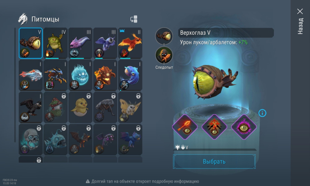 Верхоглаз 5 с тремя фиол навыками; Жаба 4 с тремя синими навыками; Мурена 3 с двумя синими навыками; Сова 3, два синих навыка; Феникс 2, один синий навык; Кусака 1; Бритвожук 1; Демон 1; Наблюдатель 1; Осьминог 1; Ворон 1.