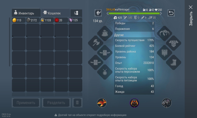 Кошелек: 113 золотых монет, 2172 серебра, 1133 очка влияния, 198, монет имира, 1320 монет арены.