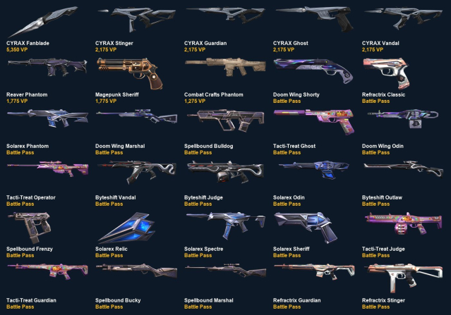 CYRAX Fanblade, CYRAX Stinger, CYRAX Guardian, CYRAX Ghost, CYRAX Vandal, Reaver Phantom, Magepunk Sheriff, Combat Crafts Phantom, Doom Wing Shorty, Refractrix Classic, Solarex Phantom, Doom Wing Marshal, Spellbound Bulldog, Tacti-Treat Ghost, Doom Wing Odin, Tacti-Treat Operator, Byteshift Vandal, Byteshift Judge, Solarex Odin, Byteshift Outlaw, Spellbound Frenzy, Solarex Relic, Solarex Spectre, Solarex Sheriff, Tacti-Treat Judge, Tacti-Treat Guardian, Spellbound Bucky, Spellbound Marshal, Refractrix Guardian, Refractrix Stinger