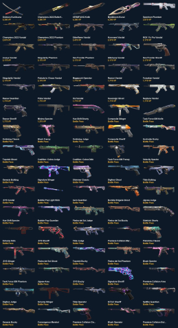 Onimaru Kunitsuna, Champions 2022 Butterfly Knife, XERØFANG Knife, Mystbloom Kunai, Spectrum Phantom, Champions 2023 Vandal, Champions 2022 Phantom, Elderflame Vandal, Kuronami Vandal, RGX 11z Pro Vandal, Araxys Vandal, Singularity Phantom, Neo Frontier Phantom, Glitchpop Vandal, Neo Frontier Sheriff, Singularity Vandal, Prelude to Chaos Vandal, Magepunk Operator, Reaver Vandal, Forsaken Vandal, Reaver Guardian, Prime Vandal, Oni Vandal, Sovereign Ghost, Neptune Vandal, Reaver Sheriff, Minima Spectre, Hue Shift Shorty, Composite Stinger, Task Force 809 Knife, Goldwing Classic, Blush Frenzy, Goldwing Judge, Composite Sheriff, Hydrodip Bucky, Topotek Ghost, Coalition: Cobra Judge, Coalition: Cobra Odin, Task Force 809 Frenzy, Velocity Spectre, Genesis Bulldog, Signature Stinger, Shimmer Classic, Digihex Ghost, Tilde Bulldog, .SYS Vandal, Bubble Pop Light Stick, Aero Guardian, Bumble Brigade Ghost, Jigsaw Judge, Hue Shift Spectre, Bubble Pop Guardian, Piedra del Sol Judge, Piedra del Sol Bucky, Sidekick Shorty, Schema Odin, .SYS Sheriff, Tilde Judge, Premiere Collision Marshal, Pistolinha Classic, .SYS Stinger, Piedra del Sol Ghost, Topotek Bucky, Piedra del Sol Phantom, Blush Spectre, Task Force 809 Phantom, Jigsaw Ares, .SYS Bucky, Signature Sheriff, Premiere Collision Ares, Digihex Judge, Schema Stinger, Tilde Operator, K/TAC Sheriff, Spitfire Guardian, Genesis Bucky, Convergence Marshal, Premiere Collision Classic, Blush Operator, Premiere Collision Bulldog, Shimmer Stinger, Shimmer Bulldog, Hydrodip Judge, Schema Sheriff, Wayfinder Shorty, Bumble Brigade Ares, Bumble Brigade Judge, Velocity Phantom, Task Force 809 Marshal, Convergence Frenzy, Bubble Pop Judge, Digihex Ares, Immortalized Stinger, Signature Marshal, Schema Vandal, Hue Shift Bulldog, Hue Shift Phantom, Topotek Odin, Genesis Shorty, Goldwing Ares, Convergence Stinger, Bubble Pop Vandal, Blush Guardian, Immortalized Vandal, Hydrodip Guardian, Coalition: Cobra Marshal, Peacekeeper Sheriff, Monarch Shorty, Velocity Bulldog, Spitfire Operator, Digihex Bulldog, Coalition: Cobra Frenzy, Shimmer Judge, Velocity Karambit, Bumble Brigade Bulldog, Bubble Pop Classic, Composite Knife, Spitfire Ghost, Immortalized Guardian, Composite Phantom, Convergence Phantom, Aero Spectre, .SYS Melee, Task Force 809 Spectre, Genesis Operator, Finesse Classic, Hydrodip Frenzy, Composite Marshal, Velocity Shorty, Spitfire Ares