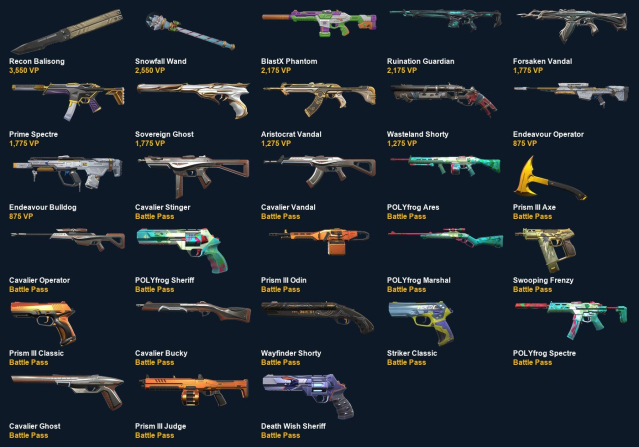 Recon Balisong, Snowfall Wand, BlastX Phantom, Ruination Guardian, Forsaken Vandal, Prime Spectre, Sovereign Ghost, Aristocrat Vandal, Wasteland Shorty, Endeavour Operator, Endeavour Bulldog, Cavalier Stinger, Cavalier Vandal, POLYfrog Ares, Prism III Axe, Cavalier Operator, POLYfrog Sheriff, Prism III Odin, POLYfrog Marshal, Swooping Frenzy, Prism III Classic, Cavalier Bucky, Wayfinder Shorty, Striker Classic, POLYfrog Spectre, Cavalier Ghost, Prism III Judge, Death Wish Sheriff