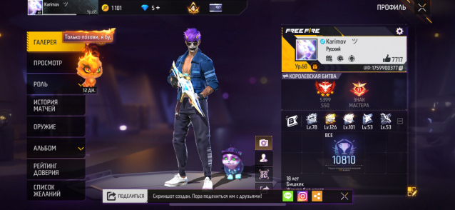 Подробное описание: Продам аккаунт Free Fire (68 LVL) | Золотой McLaren | ХМ8 эво и МП40