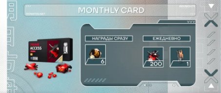 Подробное описание: 🔹 MONTHLY CARD 🎫 включает в себя: 6× Исконных Обломков сразу при покупке, 200× Орундума за ежедневный вход в течение 30 дней, 1× Экстренный Бустер Рассудка за вход в течение 30 дней. ⚠️ Обратите внимание: Этот товар активен на 30 дней с момента покупки. Всего вы можете купить не большё трёх карт за раз. Суммарный лимит активных дней на аккаунте — не больше 90.