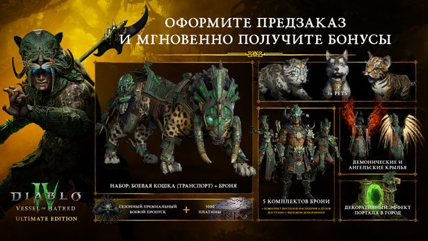 Отразите натиск зла с самым полным изданием Vessel of Hatred. Оформите предзаказ, чтобы мгновенно получить питомца-тигра Наталью², набор найденных под землей доспехов из Наханту, декоративный предмет «Крылья веры», портал в город «Дорога в Кураст» и 3000 платины, а также награды версии Deluxe, среди которых питомец-пес Хратли², набор транспорта «Боевая кошка из Наханту»², питомец снежный леопард Алькор², один жетон премиального боевого пропуска в Diablo IV и самоцвет «Плач Матери» в Diablo Immortal®³. Кроме того, с выходом дополнения Vessel of Hatred вы получите доспехи наследника духов «Скиталец завесы из Наханту».