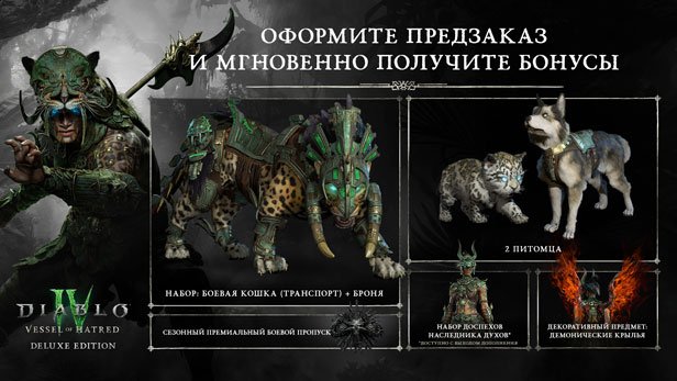 Сразитесь против сил зла — оформите предзаказ издания Vessel of Hatred Deluxe Edition, чтобы сразу же получить питомца-пса Хратли², питомца снежного леопарда Алькора², набор транспорта «Боевая кошка из Наханту»², один жетон премиального боевого пропуска и самоцвет «Плач Матери» в Diablo Immortal®³. С выходом дополнения Vessel of Hatred вы также получите доспехи наследника духов «Скиталец завесы из Наханту».