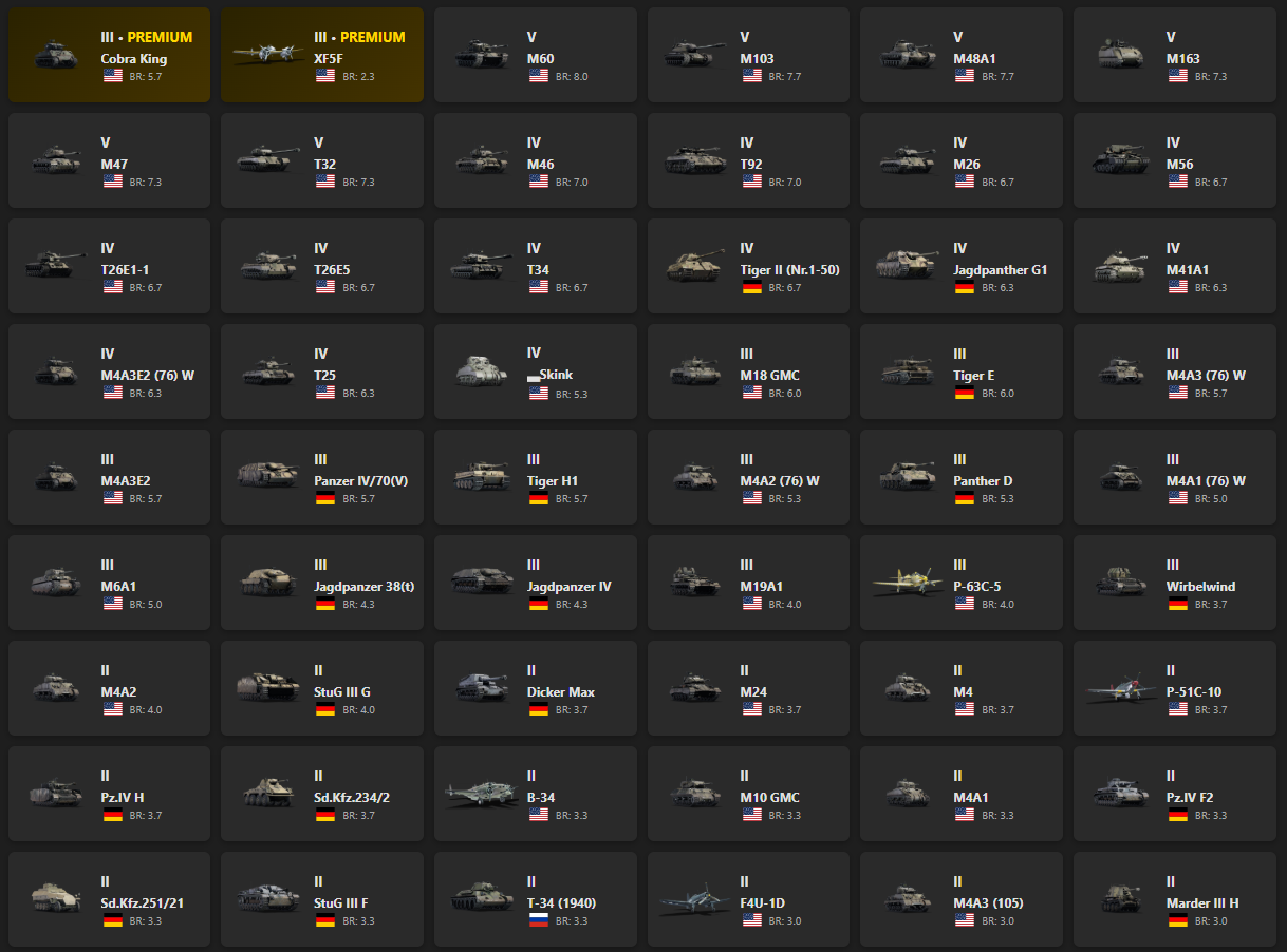 V - 6 Cobra King, XF5F, M60, M103, M48A1, M163, M47, T32, M46, T92, M26, M56, T26E1-1, T26E5, T34