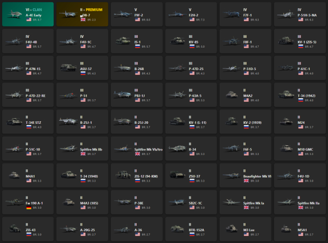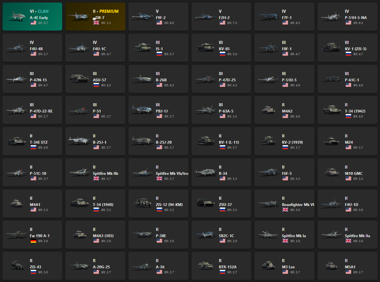 VI - 1, V - 2 A-4E Early, DB-7, F9F-2, F2H-2, F7F-1, P-51H-5-NA, F4U-4B, F4U-1C, IS-1, KV-85, F8F-1, KV-1 (ZiS-5)