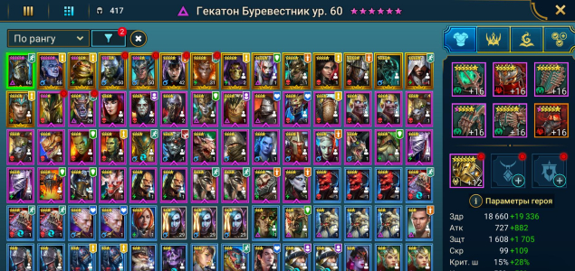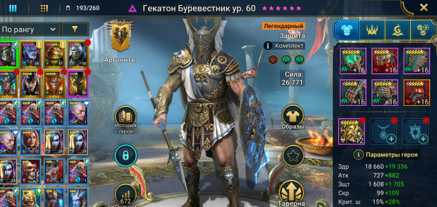 Гекатон + Нарма, лучшее легендарки для закрытия контента. Сун Вуконг, Микеланджело и неплохие эпики. 3 сакрала, 5 темных и 23 древних осколка, 3800 рубинов. 25000 Энергии