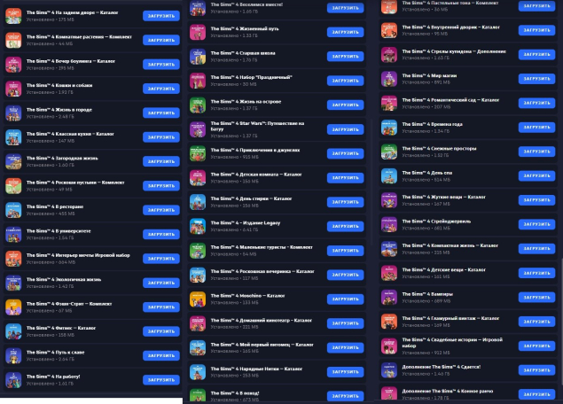 Базовая игра, На Работу, Веселимся Вместе, Жизнь в Городе, Кошки и собаки, Времена года, Путь к славе, Жизнь на острове, В университете, Снежные просторы, Загородная жизнь, Старшая школа, Жизненный путь, Конное ранчо, Сдаётся, Стрелы купидона, В поход, День спа, В ресторане, Вампиры, Родители, Приключения в джунглях, Стрейнжервиль, Мир магии, Свадебные истории, Star Wars: Путешествие на Батуу, Интерьер Мечты, Роскошная вечеринка, Внутренний дворик, Классная кухня, Жуткие вещи, Домашний кинотеатр, Романтический сад, Детская комната, На заднем дворе, Гламурный винтаж, Вечер боулинга, Фитнес, Детские вещи, День Стирки, Мой первый питомец, Moschino, Компактная жизнь, Нарядные нитки, Паранормальное, Маленькие Туристы, Фэшн-Стрит, Пастельные Тона, Роскоши Пустыни, Командные Растения