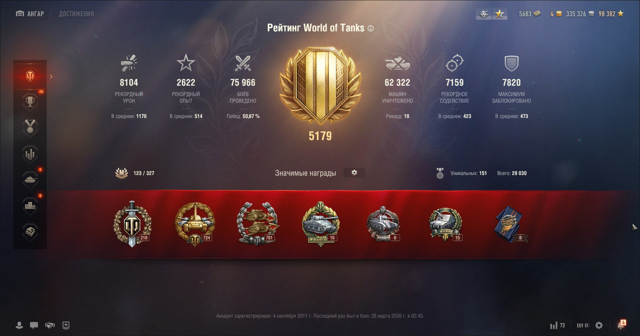 Подробное описание: Аккаунт 2011г. Без привязок. На многих 10 более 100к опыта. Некоторые исследованы, но не выкуплены. Количество серебра и опыта динамично, уточняйте. Собака в ангаре