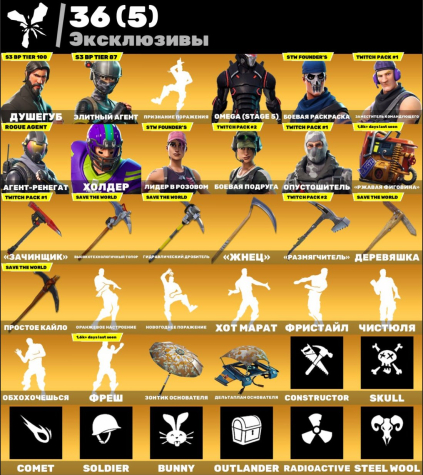 🎯 ЭЛИТА 3 СЕЗОНА (МЕЧТА ТРАЙХАРДЕРА): Полностью вкачанный боевой пропуск 3 сезона! В инвентаре лежат любимцы киберспортсменов — Элитный агент (Elite Agent) и Душегуб (The Reaper). В комплекте идет легендарная кирка Верный карандаш (Trusty No. 2).
