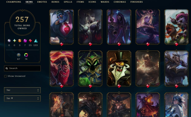 ✅ Skins: 257 total, including rare old skins (Fiddlesticks & Alistar)