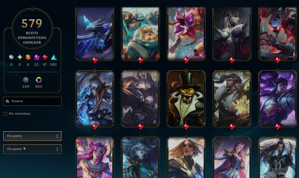Много скинов, хороший ммр как в солоку так и во флексе(чалик ммр флекс).Аккаунт был много сезонов в чалике по флексе, несколько раз в солоку.