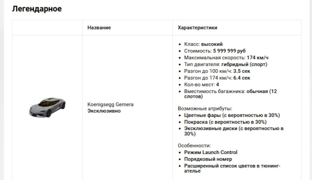 Подробное описание: Koenigsegg Gemera — один из первых четырёхместных автомобилей компании Koenigsegg. Максимальная скорость в игре: 174 км/ч фул мальборо и розовые фары фт