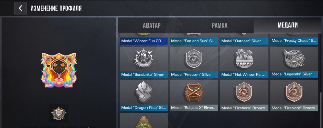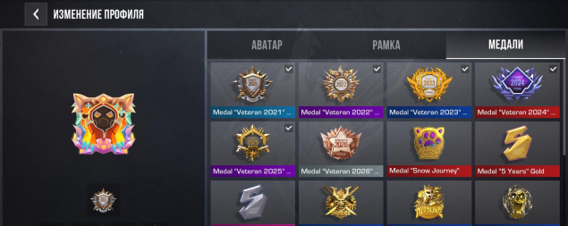 Медали: Полный набор ветеранских медалей за годы: 2021, 2022, 2023, 2024, 2025. Также есть медаль «Syndicate» Gold, «Kitsune Dream» и другие редкие награды.