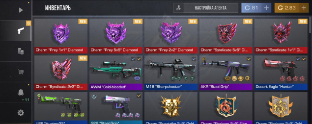 Инвентарь: * Много алмазных (Diamond) шармов: Prey 1v1, 5v5, 2v2; Syndicate 5v5, 1v1, 2v2.