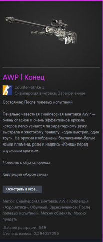 Краткое описание: 💎AWP КОНЕЦ💎💘ЛЮБОЕ ВРЕМЯ💘💎БЫСТРО И НАДЁЖНО💎 ✨ | ⚔️🔥 БЕЗ ОТМЕНЫ ТРЕЙДА🧨 | 📅 КАЧЕСТВО 🔥💎