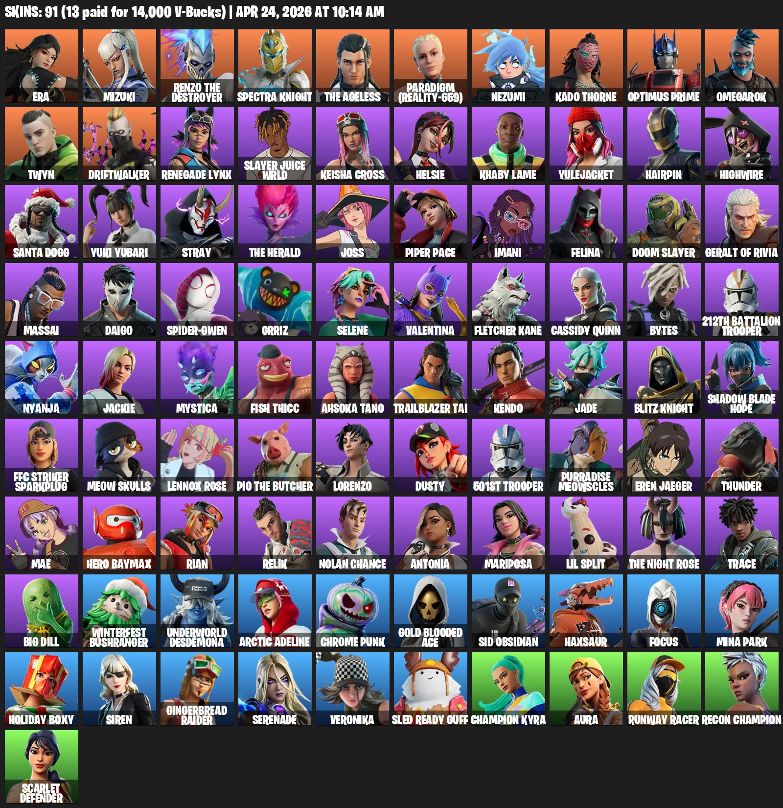 Краткое описание: ✅Быстрая выдача✅Slayer Juice WRLD+Siren+Ol' Woody✅91 Skins+83 pickaxes✅100 VB✅2767LVL✅