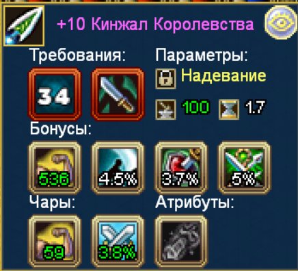Подробное описание: 34 лвл +10 кинжал авто атака с весны