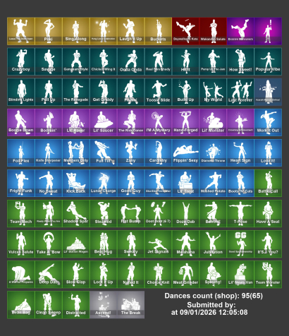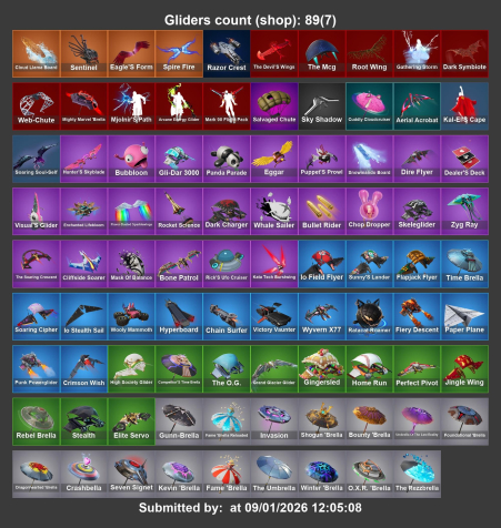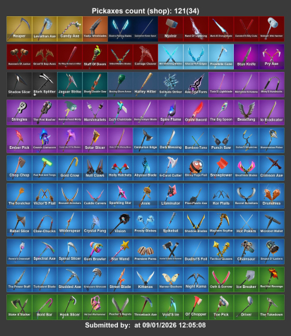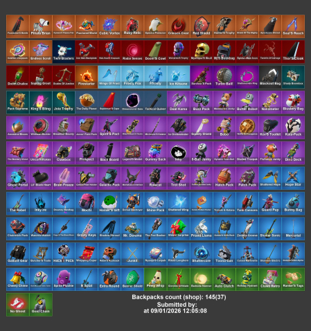 Skins 118, Pickaxes 121, Emotes 95, V-Bucks 50, Back Blings 145, Gliders 89, Wraps 88, Banners 94, Sprays 105