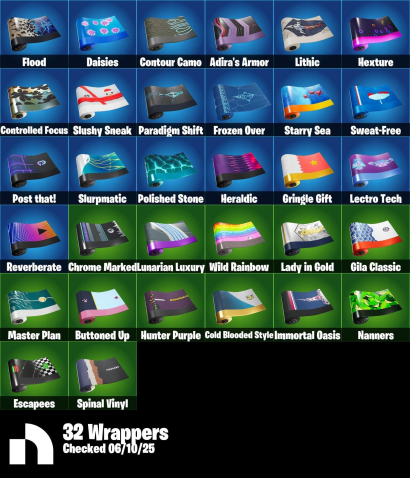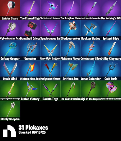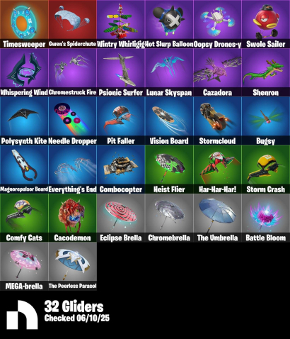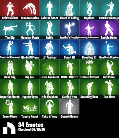 Skins, Pickaxes 31, Emotes 34, V-Bucks, Back Blings, Gliders, Wraps, Banners, Sprays