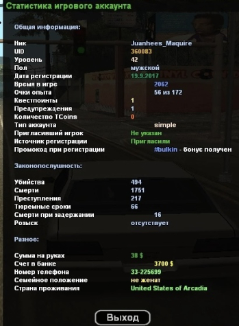 Аккаунт Trinity RP #1 сервер. 42 уровень. Машина premier, скилл автодилера 4, скилл промышленного альпиниста 4, скилл фермера 2, скилл химика 4, скилл грабителя 3, скилл оружейного диллера 2, скилл татуировщика 2.