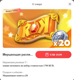 На бирже PlayNTrade Вы легко и быстро можете купить донат Rise of Kingdoms от 10 руб. Это недорого и безопасно, ведь все сделки на PlayNTrade проходят между игроками напрямую (под пристальным вниманием службы поддержки) или через гарантов. Число позиций в продаже на этой странице сейчас — 769 шт. Недавно добавленные товары стоят в списке выше остальных. Используйте фильтры и поиск по описанию, чтобы найти подходящий вариант. Обращайте внимание на отзывы и рейтинг продавца.